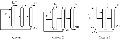 Рис. 19. Технологические схемы разделения смеси циклогексан – бензол – этилбензол экстрактивной ректификацией, разделяющий агент – анилин