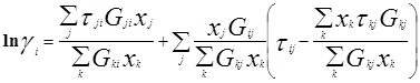 Избыточная энергия Гиббса (и соответственно логарифм коэффициента активности) делится на комбинаторную и остаточную части. Комбинаторная часть зависит только от размеров и форм отдельных молекул, она не содержит бинарных параметров. Остаточная часть, которая учитывает энергетические взаимодействия, имеет два регулируемых бинарных параметра. Выражение для коэффициента активности имеет следующий вид: