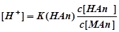 Для слабой кислоты концентрацию недиссоциированных молекул можно принять равной концентрации кислоты, т.е. [НАn] = c (НАn). Содержащаяся в БР соль МАn диссоциирует нацело (полностью), поэтому концентрация сопряженного основания Аn-, образовавшегосявследствие диссоциации соли МА, значительно больше, чем вследствие диссоциации слабой кислоты НАn, поэтому можно считать, что[Аn-] = c (МАn). Подставим полученное в уравнение для К(НАn)