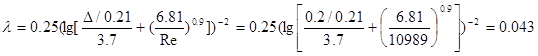 Коэффициент трения λ рассчитываем по формуле: