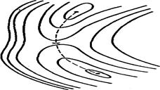 Типичный вид простейшей двумерной ППЭ показан на рисунке 2.1.5.2. Здесь минимумы соответствуют исходным реагентам и конечным продуктам реакции, а седловая точка – переходному состоянию. Минимумы на рисунке соединены пунктирной линией, которая проходит по дну долины на ППЭ через седловую точку. Эта линия показывает путь реакции в двумерном пространстве или траекторию движения реагентов в ходе реакции. Для большинства реакций ППЭ имеют более сложный вид.