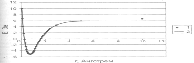 Рисунок 2.1.5.3. Зависимость потенциальной энергии молекулы водорода от расстояния между атомами: 1 — расчет полуэмпирическим методом РМЗ; 2 — аппроксимация потенциалом Морзе.