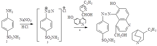 В 1919 году был синтезирован производное сульфаниламида путем его диазотирования (3) и его последующего сочетания с дигидрокупреином (4), но обнаруженное противострептококковое действие было приписано купреновому ядру.