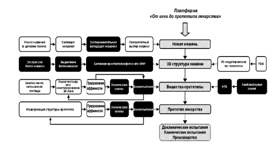 Рисунок 1.1 Общая структура платформы от гена до прототипа лекарства. Экспериментальные блоки показаны черным цветом, компьютерные – белым.