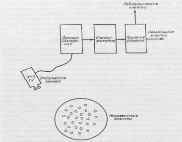 В качестве примера построения классификационного правила рассмотрим следующую воображаемую задачу. Предположим, что мы хотим автоматизировать процесс идентификации аномальных клеток при анализе крови в клинической лаборатории. Попробуем составить опытный проект оптической воспринимающей системы, способной отличить лейкимические клетки от здоровых на основе оптической проницаемости (рис. 2.1.1). Будем считать, что если прозрачность клетки превосходит некоторый уровень Хо, то она относится к лейкемическим клеткам.