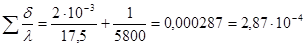 Толщина труб 2,0 мм, материал – нержавеющая сталь; λст = 17,5 Вт/(м ∙ К). Сумма термических сопротивлений стенки и загрязнений (термическим сопротивлением со стороны греющего пара можно пренебречь) равна: