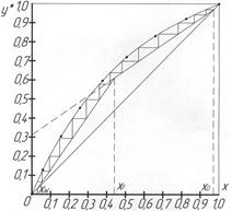 Минимальное значение N(R+1) соответствует числу ступеней изменения концентраций, равному 14, и рабочему флегмовому числу R=2.12. Данный вывод графически интерпретирует рис. 3.22.