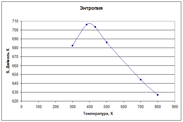 3. Рассчитайте изменение энтропии реакции. Постройте график зависимости изменения энтропии от температуры с шагом 200 К в интервале 300–800 К.