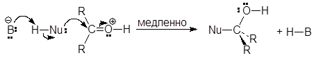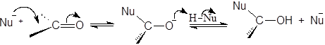 А. Нуклеофильное присоединение - наиболее характерная реакция карбонильных соединений. Частично положительно заряженный атом углерода карбонильной группы атакуется нуклеофильным реагентом. Получающийся продукт стабилизируется, присоединением на конечной стадии протона. Таким образом, для карбонильных соединений характерны реакции нуклеофильного присоединения AN, а не АЕ, как это характерно для алкенов. Атака карбонильной группы нуклеофилом может происходить снизу или сверху плоского фрагмента молекулы: