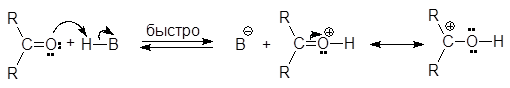 Реакции по карбонильной группе могут катализироваться как кислотами благодаря увеличению положительного заряда на атоме углерода.