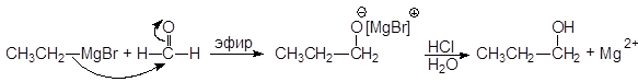 Присоединение к формальдегиду приводит к образованию первичных спиртов.