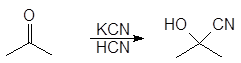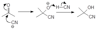 Циановодород присоединяется к альдегидам и кетонам с образованием a-окси-нитрилов ( циангидринов). Сама синильная кислота является очень слабым нуклеофилом и поэтому реагирует очень медленно. С гораздо большей скоростью карбонильная группа реагирует с цианид-ионом.