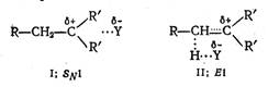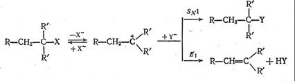 Механизм отщепления, приведенный на данной схеме, обозначается как Еl (elimination - отщепление). Так как скорость определяющей стадией, как и в случае SNl-реакции, является диссоциация субстрата по связи С─Х, влияние всех факторов на скорость процесса Еl то же, что и для реакций мономолекулярного замещения. Образовавшийся на скоростьопределяющей стадии карбкатион может взаимодействовать с нуклеофилом либо за счет отрыва протона (тогда образуются продукты отщепления), либо за счет уже рассмотренного процесса с образованием продукта замещения. Таким образом, соотношение продуктов, соответствующих замещению и отщеплению, а также соотношение образующихся олефинов зависит от отношения скоростей быстрых стадий взаимодействия нуклеофила с карбкатионом.