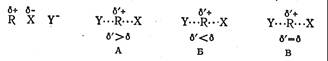 В случае реакций мономолекулярного замещения сделать вывод о влиянии заместителей на скорость процесса достаточно легко. В случае SN2-реакций картина более сложна. Как и ранее необходимо рассмотреть, как меняется электронная плотность на реакционном центре при переходе от исходных соединений к активированному комплексу. Возможно такое течение SN2-процесса, при котором на реакционном центре не происходит изменения заряда. Для этого необходимо, чтобы реакция замещения шла строго согласованно, т. е. в переходном состоянии связь с нуклеофилом должна образовываться точно в той же степени, в которой нарушается связь с уходящей группой. (Другими словами, сумма порядков связей с нуклеофилом и уходящей группой в переходном состоянии должна равняться единице). При этом можно ожидать, что электронные эффекты заместителей не будут существенно сказываться на скорости процесса. (Более строго, и в этом случае для реакций анион─молекула заместители, проявляющие электроноакцепторное влияние, должны несколько ускорять процесс замещения за счет стабилизации отрицательно заряженного активированного комплекса.) Однако, хотя реакция бимолекулярного замещения и является синхронной, т. е. процессы разрыва старой связи и образования новой происходят на одной и той же стадии реакции, они не являются строго согласованными. Разрыв старой связи может обгонять образование новой (случай А, сумма порядков связей меньше единицы, электронная плотность на реакционном центре ниже в активированном комплексе, чем в исходной молекуле). Такое переходное состояние может быть названо «рыхлым» (loose). В других случаях разрыв старой связи может отставать от образования новой (случай Б, сумма порядков связей больше единицы, электронная плотность на реакционном центре больше в активированном комплексе, чем в исходной молекуле). Такое анионоподобное переходное состояние называют «сжатым» (tight). Только в некоторых случаях разрыв старой и образование новой связи осуществляются строго согласованно («центральное» переходное состояние В).