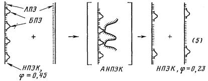 Этот механизм широко распространен для различных макромолекулярных систем. Ранее представление об образовании промежуточных соединений, обозначенных нами как ассоциированные поликомплексы (АНПЭК), было использовано при анализе межмакромолекулярных реакций замещения полиэтиленгликоля поли-NN-винилпирролидоном в стехиометричных поликомплексах, образованных полиметакриловой кислотой с первым из них [13, 14]. Именно этот механизм, по-видимому, лежит в основе конкурентной адсорбции макромолекул на межфазных границах [15]. В изученных нами реакциях возникновение промежуточных АНПЭК оказывается возможным благодаря наличию дефектов в структуре ПЭК. Такие дефекты могут быть представлены в виде петель, составленных из последовательностей разобщенных звеньев обоих полиэлектролитов, образующих ПЭК. Эти дефекты и могут служить участками, которые способны взаимодействовать либо с другими частицами НПЭК, либо с полиионами свободного ЛПЭ, как показано на схеме (5). Существенно, что размер дефектов и их количество возрастают по мере увеличения концентрации в окружающей среде низкомолекулярных солей [16]. В то же время соли экранируют электростатическое отталкивание между одноименно заряженными реагирующими частицами, знак заряда которых определяется зарядом ЛПЭ, а величина заряда составом реагирующих частиц; этим объясняется необходимость введения в реакционные системы низкомолекулярных солей [3—7].