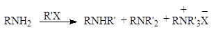 Амины бурно реагируют с алкилгалогенидами, образуя смеси аминов и солей четвертичных аммониевых оснований: