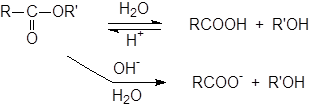 При катализе основаниями, атакующей частицей служит более сильный нуклеофил – OH-группа. Эта реакция носит название омыления и приводит к соли кислоты. Кислоты катализируют реакцию за счет того, что положительный заряд атома углерода карбонильной группы становится больше, и, следовательно, он легче подвергается атаке нуклеофилом. Обе реакции обратимы, и поэтому практической ценностью обладают только тогда, когда равновесия удаётся каким либо образом сместить вправо. А поскольку образование соли – один из таких способов, гидролиз сложных эфиров в препаративных целях почти всегда проводят в щелочных растворах, за исключением тех случаев, когда вещество неустойчиво к действию оснований.