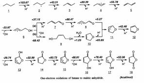 Например, смесь 1,5 % бутана с воздухом при бесконечном по времени их контакте при температуре 4500 С превратится в смесь диоксида углерода, воды и остатка воздуха. В присутствии катализатора, состоящего из смеси V, P и O, в течение 2-3 секунд примерно половина бутан окислится в малеиновый ангидрид.