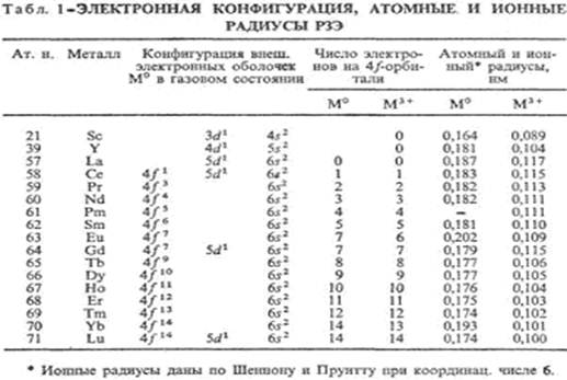 Электронная структура, лантаноидное сжатие, электронная конфигурация РЗЭ дана в табл. 1, у ионов М3+(М = Sc, Y, La) устойчивая конфигурация инертных газов. У Sc, Y и La в образовании химической связи участвуют d- и s-электроны, у других РЗЭ могут участвовать также f-электроны, однако близкие химические свойства РЗЭ определяются главным образом внешними d-и s-электронами. Поэтому эти элементы объединены в одну группу.