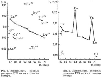 Например, при переходе из металлического состояния в парообразное мерой является давление пара металлов. При 25 °С давления паров РЗЭ различаются более чем на 40 порядков, а при 1000 °С - примерно на 10 порядков (минимальное давление характерно для La, Gd и Lu, максимальное - для Еu и Yb). Это связано с большой разницей в энергии, необходимой для перехода 4 d -электрона на 5d-уровень. С другой стороны, есть свойства, остающиеся примерно постоянными для всех РЗЭ. Вследствие лантаноидного сжатия при переходе от La к Lu ионные радиусы РЗЭ и их атомные радиусы (кроме Еu и Yb) плавно уменьшаются (рис. 1, 2), плотность простых веществ увеличивается [31].