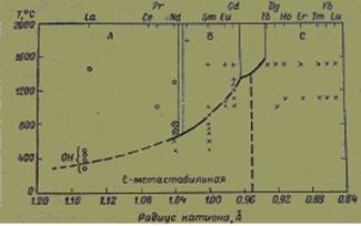 Области устойчивости различных кристаллических форм, полученные в данной работе, приведены на рис. 4, из которого следует, что А-тип структуры оксидов редкоземельных элементов устойчив для больших ионов, В-тип — для промежуточных и С-тип — для малых ионов. Кроме этого, было установлено, что С-тип может встречаться как метастабильная форма при низких температурах для всех А- и В-типов оксидов.