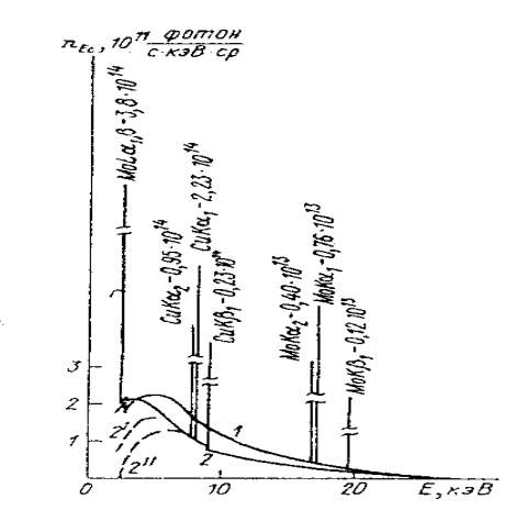 Рис.2. Спектры рентгеновских трубок с молибденовым и медным анодом при разной толщине бериллиевого окна.
