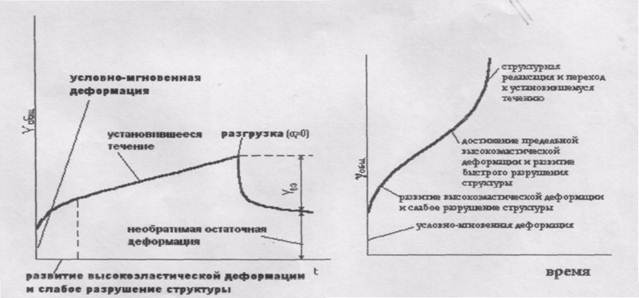 При относительно низких напряжениях сначала развиваются высокоэластические деформации, однако постепенно доминирующее значение приобретает течение без внешних признаков разрушения структуры. При более высоких напряжениях наблюдается S-образная зависимость деформации от времени. После достижения предельной высокоэластической деформации начинается интенсивное разрушение структуры, приводящее к увеличению скорости деформирования. Таким образом, кривые зависимости деформации сдвига γ от времени при достаточно высоких напряжениях сдвига имеют три участка. Протяжённость второго участка зависит от действующего напряжения. При высоких его значениях этот участок вырождается в точку.