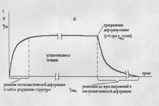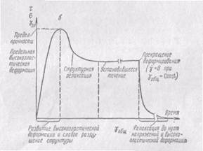 Простейшим случаем деформации сдвига является установившееся течение, когда скорости и напряжения сдвига во всех точках тела сохраняют неизменные значения. В этих условиях высокоэластическая деформация становится постоянной, а необратимая деформация увеличивается во времени равномерно.