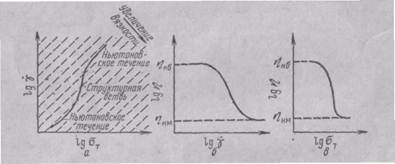 На рис. 3 графически представлено уравнение 1 в логарифмических координатах. График зависимости скорости сдвига от напряжения сдвига называется кривой течения. Она описывает совокупность установившихся режимов течения с разными скоростями и напряжениями сдвига (S-образная кривая на рис. 3,а). При достаточно низких и высоких значениях скоростей и напряжений и скоростей эти величины связаны между собой прямой пропорциональной зависимостью, что соответствует наибольшей и наименьшей ньютоновским вязкостям (ηнб и ηнм), причём постоянные значения вязкостей удовлетворяют условию ηнб > ηнм. В зависимости от природы полимерной системы и температуры отношение ηнб/ηнм может изменятся от значений, близких к единице, до нескольких десятичных порядков.