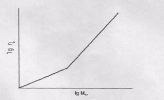 Влияние молекулярного веса. Для перемещения всей макромолекулы необходимо совместное перемещение многих сегментов. Это значит, что сопротивление, оказываемое макромолекулой в потоке, должно зависеть от её молекулярного веса. Чем больше М тем круче возрастает вязкость. На рис. 4 представлена общая зависимость вязкости от молекулярного веса, которая в двойных логарифмических координатах представлена двумя пересекающимися прямыми. Точка их пересечения - критический молекулярный вес Мкр, а соответствующая ему степень полимеризации - критической степень полимеризации Ркрит.