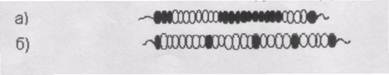Молекула блок-сополимера содержит относительно длинные участки одного химического состава, разделёнными полимерными участками другого химического состава (а) или низкомолекулярными