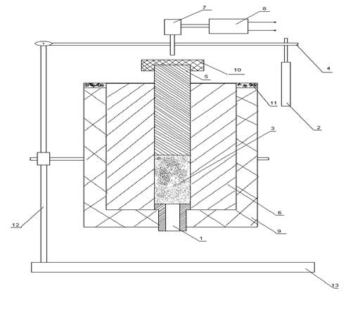 1-капилляр; 2-груз; 3-исследуемый образец; 4-рычаг; 5-шток; 6-камера (бомба); 7-датчик перемещения; 8-индикатор перемещения; 9-печь с электрообогревом; 10-теплоизулирующая шляпка; 11-съёмная крышка; 12-штатив; 13-опорная плита.