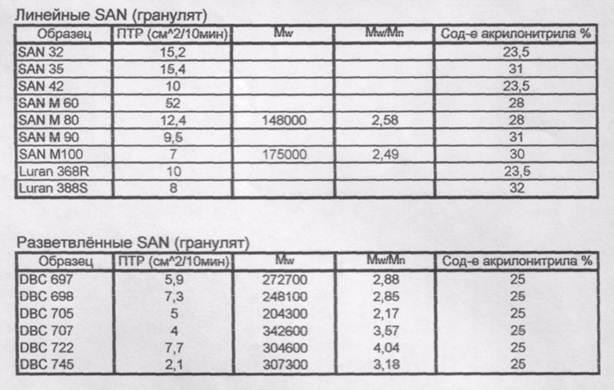 Сополимер САН, обладая повышенной стойкостью к бензину и маслам, относительно высокой теплостойкостью, применяется в автомобилестроении и приборостроении, в т.ч. в производстве кухонных приборов. К настоящему времени в России разработана и готовится к внедрению вторая марка этого сополимера с еще более высокой текучестью (ПТР более 3 г/10 мин при 200°С/5 кг). При этом практически решена проблема характерной для этого сополимера желтизны.