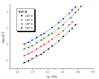 Эксперименты с образцами сополимеров стирола и акрилонитрила проводились при четырёх температурах и при значениях логарифма напряжений сдвига lgτ от 3 до 5.5 [Па]. На рис.5 представлены результаты экспериментов для типичного представителя образцов линейных САН (SAN 32) - качественно кривые выглядят одинаково.