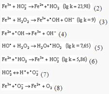 В качестве восстановителей и одновременно катализаторов процесса могут выступать металлы переменной валентности, в том числе железо (общая концентрация ионов железа в речной воде составляет 0,2-1,2 мг/л). Полная схема катализа ионами железа распада перекиси водорода представлена ниже. Логарифмы скоростей реакций приведены для температуры 298 К.