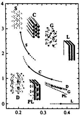 Надмолекулярные структуры. Сплошными линиями обозначены стабильные состояния: L — ламеллярная фаза, G — гироидная, С — колончатая, S — кубическая мезофаза ; штриховыми — метастабильные: PL — перфорированная ламеллярная, D — двойная алмазная.
