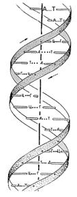 Остов молекул ДНК состоит из сахаро-фосфатных цепочек, а к каждому сахару присоединены плоские пуриновые или пиримидиновые основания, причем двухспиральные молекулы ДНК - сополимеры, содержащие четыре типа природных оснований: аденин (A), тимин (T), гуанин (Г) и цитозин (Ц). В двойной спирали основания, принадлежащие соседним цепям, соединены водородными связями (А-Т и Г-Ц). Для таких плоских пар их контакты друг с другом при укладке в стопку (стэкинг) оказываются энергетически более выгодными, чем их контакты с растворителем - водой, между лежащими друг над другом основаниями возникает так называемое (стэкинг) взаимодействие. Поэтому две взаимно комплементарные молекулы ДНК (у которых основанию А в одной цепи соответствует Т в другой, а основанию Г соответствует Ц) образуют регулярную двойную спираль, в которой основания связаны водородными связями в пары, пары уложены в стопку, а сахаро-фосфатные остовы двумя винтовыми линиями обвивают стопку. Наиболее плотная укладка оснований и соответственно наибольшие стэкинг-взаимодействия наблюдаются, когда плоскости оснований перпендикулярны оси двойной спирали (В-форма ДНК).