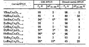 В настоящее время в ИСМАН методом СВС синтезированы практически все известные высокотемпературные сверхпроводники на основе иттрия, других редкоземельных металлов, висмута и таллия. В табл. 2 приведены результаты по измерению сверхпроводящих свойств ВТСП на основе РЗМ. Наиболее подробно изучены механизм и закономерности СВС на примере получения иттрий-бариевой керамики состава Y123 по реакции: