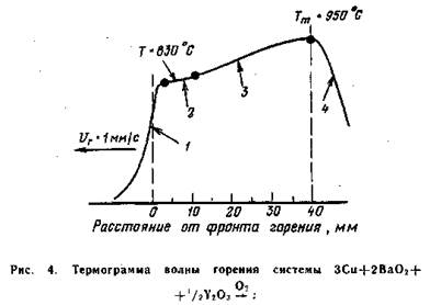 Полученная информация о механизме взаимодействия компонентов свидетельствует о том, что образование ВТСП в СВС является сложным процессом. Основное тепловыделение, обеспечивающее распространение волны синтеза и образование фазы (структуры) конечного целевого продукта, происходит неодновременно в пространственно разделенных зонах.