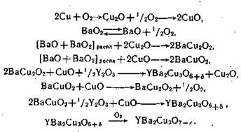 1 — окисление (горение) меди и разложение пероксида бария; 2 — образование расплава из купратов, начало растворения Y2O3; 3 — дальнейшее растворение Y2O3, кристаллизация Y123ТЕТРА; 4 — образование Y123ОРТО