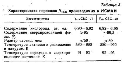 В зависимости от условий технологического процесса могут производиться порошки с содержанием кислорода ³ 6,9 ат. ед. и орторомбической фазы Y123 > 95% с размерами частиц и удельной поверхностью в диапазоне соответственно 1—50 мкм и 0,04—7,50 м2/г. В настоящее время на опытном производстве института выпускаются две марки порошков: Y123СВС—/1 и Y123СВС—/2. Некоторые их характеристики приведены в табл. 3.