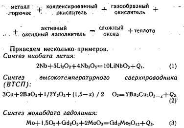 Синтез проводят в печах при высоких температурах в кислородсодержащей среде в течение длительного времени. Иногда в качестве реагентов используют 'карбонаты, нитраты, пероксиды. Специфика СВС требует наличия в исходной смеси горючего и окислителя для осуществления процесса в режиме горения. Как правило, горючим при синтезе оксидных материалов может быть металл, иногда применяют его гидрид или другое соединение. Роль окислителя выполняет кислород. Реакция окисления металла является основной, она обеспечивает необходимое для СВС выделение теплоты. При этом кислород может быть использован из двух источников: внутреннего (конденсированный легко разлагающийся нитрат, пероксид и т. д.) и внешнего (например, кислород воздуха или баллонный кислород). Во многих случаях для управления процессом возможны также комбинированные варианты. При синтезе сложных оксидов, как правило, в исходную смесь добавляют активный оксидный наполнитель, наличие которого дает возможность регулировать условия горения, а также способствует формированию конечного продукта, выступая в роли кристаллической матрицы для него. Кроме того, с помощью оксидных добавок можно варьировать электромагнитные или другие свойства продуктов.