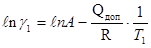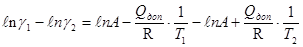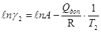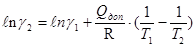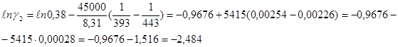 (2), где А-предэкспоненциальный множитель; Qдоп- тепловой эффект взаимодействия между связующим и наполнителем; Q- тепловой эффект рассматриваемого обратимого процесса, найти массовую долю γ2 переходного слоя в системе анилино-фенолоформальдегидная смола СФ-342А – полипропиленовая нить ППН при температуре Т2=443 К, если при Т1=393 К известно значение γ1=0,38. Тепловой эффект Qдоп взаимодействия ППН со связующим в данном случае составляет Qдоп=-45 кДж/моль. Рекомендуется записать соотношение (1) в логарифмической форме для температуры Т1 и для температуры Т2.