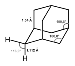 Молекула адамантана включает в себя три конденсированных циклогексановых кольца, находящихся в конформации "кресло". Параметры молекулы адамантана были определены методом дифракции электронов и рентгеновских лучей. Было установлено, что длина каждой связи "углерод — углерод" составляет 1,54 Å, а каждой связи "углерод — водород" — 1,112 Å.