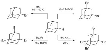 Адамантан легко вступает в реакцию с различными бромирующими реагентами, в первую очередь с молекулярным бромом. Состав и соотношение продуктов реакции могут быть различными и зависят от условий проведения реакции, в частности, наличия катализаторов.