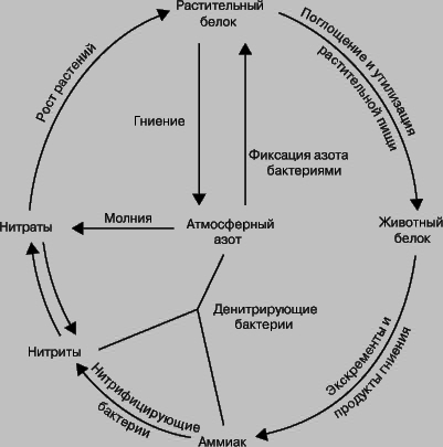 Представьте себе, что биосфера состоит из двух сообщающихся резервуаров с азотом — огромного (в нем находится азот, содержащийся в атмосфере и океанах) и совсем маленького (в нем находится азот, содержащийся в живых существах). Между этими резервуарами есть узкий проход, в котором азот тем или иным способом связывается. В нормальных условиях азот из окружающей среды попадает через этот проход в биологические системы и возвращается в окружающую среду после гибели биологических систем.