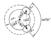 При нормальных условиях следовало бы ожидать, что связи атома кислорода с обоими водородными атомами в молекуле Н2О образуют у центрального атома кислорода очень тупой угол, близкий к 180°. Однако совершенно неожиданно этот угол равен не 180°, а всего лишь 104°31'. Вследствие этого внутримолекулярные силы компенсируются не полностью и их избыток проявляется вне молекулы. На рис. 2 показаны основные размеры молекулы воды.
