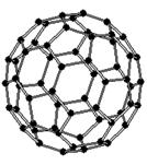 Центральное место среди фуллеренов занимает С60 (рис. 4.), который характеризуется наиболее высокой симметрией и, как следствие, наибольшей стабильностью. В этой молекуле, напоминающей покрышку футбольного мяча, и имеющей структуру правильного усеченного икосаэдра атомы углерода располагаются на сферической поверхности в вершинах 20 правильных шестиугольников и 12 правильных пятиугольников. Так что каждый шестиугольник граничит с тремя шестиугольниками и тремя пятиугольниками, а каждый пятиугольник - с пятью шестиугольниками. Эта фигура высокосимметричная: у нее существует шесть осей пятого порядка, проходящих через двенадцать противоположно лежащих попарно пятиугольников, десять осей третьего порядка, проходящих через двадцать противоположно лежащих шестиугольников, 30 осей второго порядка, проходящие через противоположно лежащие шестьдесят ребер шестиугольник-шестиугольник, 30 осей второго порядка, проходящие через все противоположные шестьдесят вершин фигуры. Существует также несколько типов плоскостей симметрии пятого, третьего и второго порядков[8].