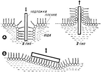 Для дальнейшего исследования полученных пленок необходим перенос их на подложку. Существует два способа переноса монослоев на твердые подложки. Первый способ состоит в «протыкании» монослоя вертикально движущейся подложкой (рис. 8A). Он позволяет получать слои как X- (молекулярные хвосты направлены к подложке), так и Z-типа (обратное направление). Второй способ – это просто касание монослоя горизонтально ориентированной подложкой (рис. 8Б). Он дает монослои X-типа.