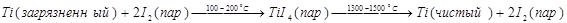 Иодидный метод относится к термическому разложению. Исходный металл в виде порошка нагревается до 100-200˚С с небольшим количеством иода в герметическом аппарате. В аппарате натянуты титановые нити, нагреваемые электрическим током до 1300-1500˚С. Титан (но не примеси) образует с иодом летучий иодид TiI4, который разлагается на раскаленных нитях. Выделяющийся чистый титан осаждается на них, а иод образует с исходным металлом новые порции иодида; процесс идет непрерывно до переноса всего металла на титановые нити: